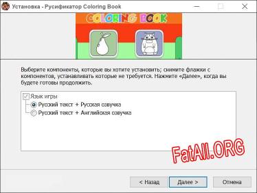 Добро пожаловать на FatAll.org! Наш русификатор обеспечит качественный перевод игры на русский язык и поможет вам получить удовольствие от игры Coloring Book на полную. У нас вы найдете только качественный русификатор, гарантирующий работу игры без сбоев. Здесь вы можете скачать русификатор для версии игры 1.0 и выше. На данный момент доступен русификатор от BReWErS.